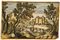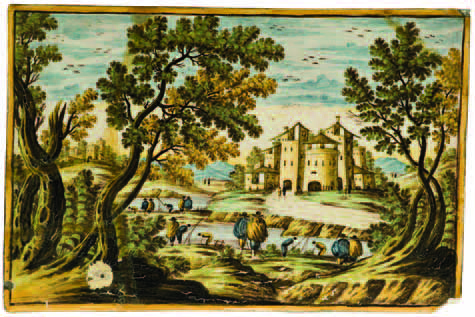 Placca in maiolica policroma, Castelli, XVIII secolo, raffigurante una scena di genere in contesto naturalistico con architetture. cm 24x36; lieve mancanza