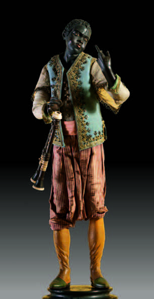 Moro suonatore con pantaloni a righe avorio e rosso, gilet in tessuto azzurro e passamaneria. Accessorio: un flauto doppio Altezza cm 40 Napoli, fine del XVIII secolo (provenienza Collezione Enzo Catello)