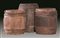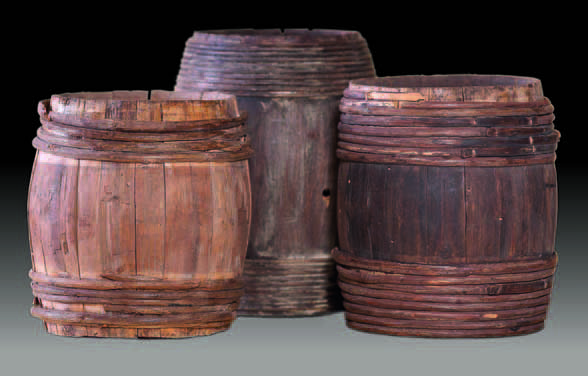 Carretto in legno con lanterna, corde e sacchi in tela. Unito a tre botti in legno. Carretto: lunghezza cm 78 ; botti: altezze cm 13,5; cm 14,5; cm 17