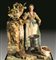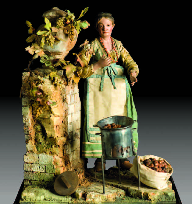 Contadina in abiti da festa, il corpetto in tessuto operato, gonna azzurra e grembiule beige. Ambientata su uno scoglio con rovina architettonica e vaso, un braciere per caldarroste e un sacco di castagne. Accessori: una collana Altezza cm 38. Teca cm 50x35x25 Napoli, XVIII/XIX secolo