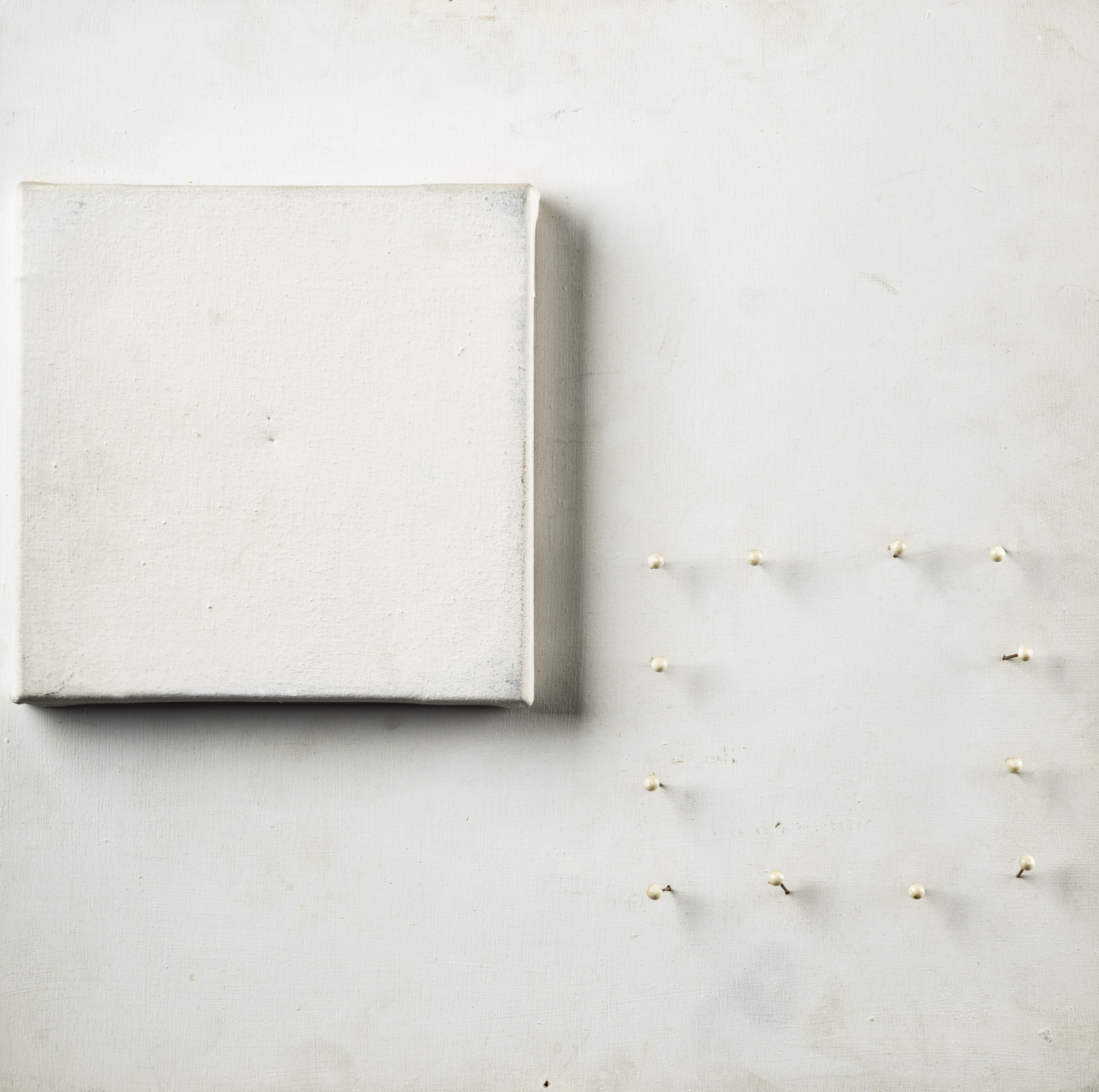 Tecnica mista, tela e inserti in plastica e ferro su tavola, cm. 33 x 33 x 2