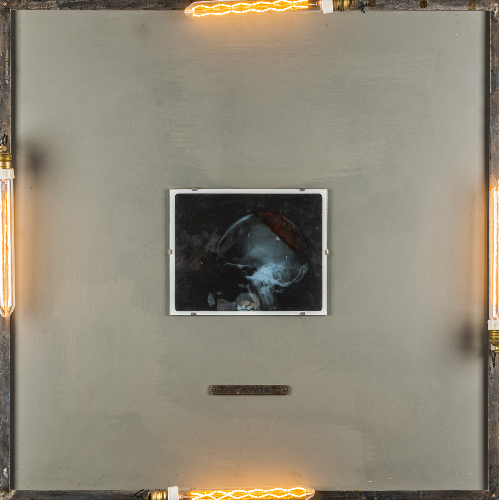 Assemblaggio, pittura su tavola, alluminio, radiografia, lampadine, cm. 100 x 100