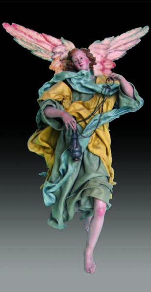 Angelo con capelli ondulati veste verde, manto giallo e svolazzo azzurro. Accessorio: un incensiere Altezza cm 38,5 Nicola Ingaldi, Napoli, fine del XVIII secolo (provenienza Collezione Bilancio)