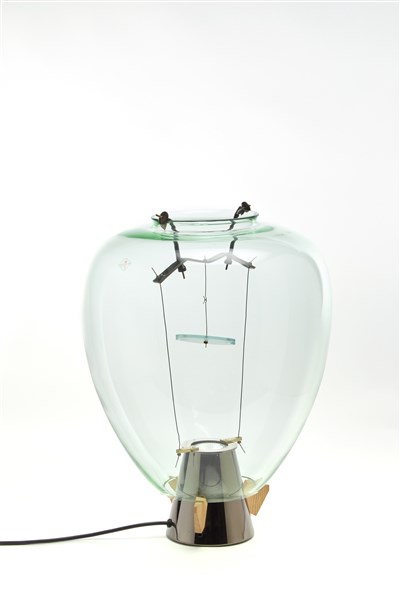 Lampada da tavolo modello "Veronese". Produzione Barovier & Toso, Murano, 1984. Vetro soffiato verdino trasparente, metallo cromato e legno. (h cm 50) (lievi difetti)