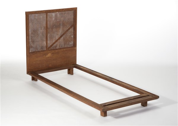 Letto singolo accoppiabile a formare un letto matrimoniale con struttura in legno massello di rovere e testata rifinita in paglia di Vienna. Milano, 1938. (cm 90x109x228) (difetti)