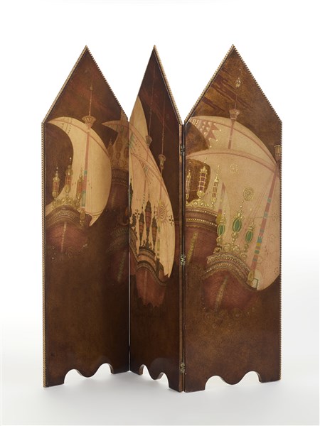 * Paravento. Produzione Tura, Lazzate, 1980. Legno e pergamena decorati a mano a leggero rilievo, in policromia e con foglia d'oro. (cm 183x185) (lievi difetti e restauri)