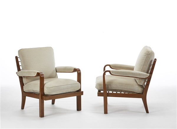 Coppia di poltrone. Esecuzione Meroni e Fossati, Lissone, 1935ca. Struttura in legno di rovere massello, seduta e schienale con sistema a tiranti in molle e corda su brevetto Knoll, rivestimenti in velluto color crème. Recanti etichetta metallica del produttore. (cm 67x80x70) (lievi difetti, piccoli restauri e piccole mancanze)
