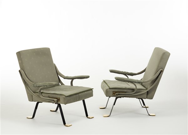 Coppia di poltrone con schienale a posizione variabile modello "Digamma". Produzione Gavina, San Lazzaro di Savena, 1957. Struttura metallica in acciaio smaltato, finiture in ottone, imbottitura in gommapiuma, rivestimento in tessuto Rubelli color salvia decorato a foglioline. (posizione coricata: cm 70x67x106; posizione dritta: cm 70x84x84) (lievi difetti)