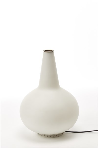 Vaso portafiori luminoso modello "1837". Produzione Fontana Arte, Milano, 1954ca. Vetro incamiciato lattimo satinato, ottone naturale e laccato bianco. (h cm 33) (lievi difetti)