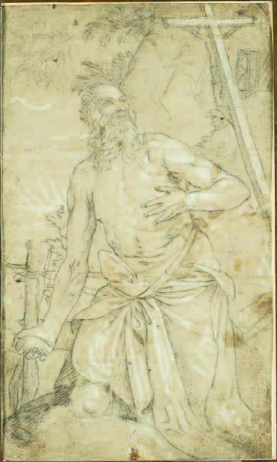 Francesco Montemezzano Verona 1555 – Venezia post 1602 SAN GEROLAMO PENITENTE matita grigia e nera su carta grigio-verde con rialzi di biacca, cm 31x18,5.