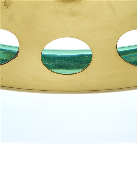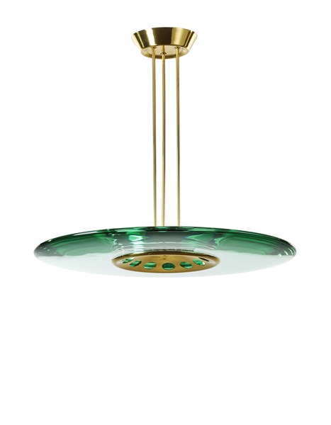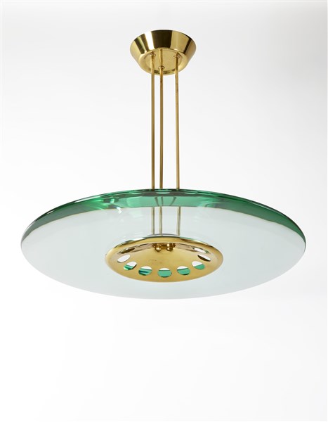 Lampadario modello "1441". Produzione Fontana Arte, Milano, anni '50. Cristallo molato a lente, montatura in ottone. (h cm 72; d cm 80) (lievi difetti)