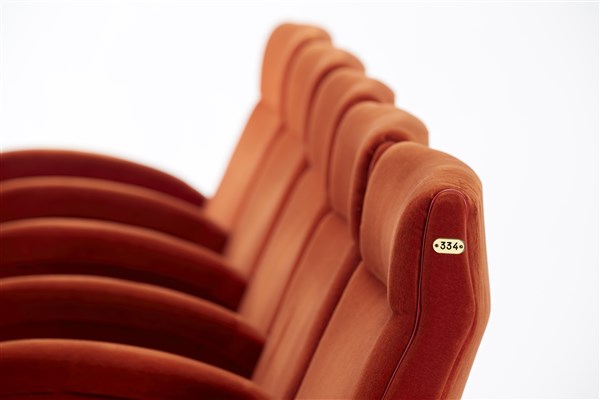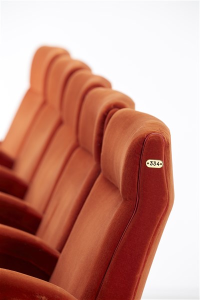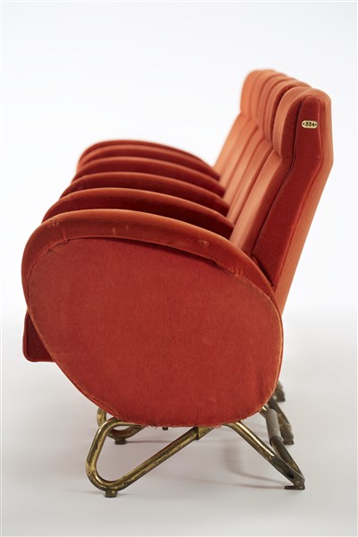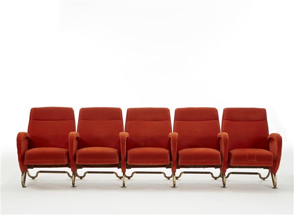 Una fila di cinque poltrone con sedile a ribalta. Torino, 1957-1958. Tubo di ottone, imbottiture rivestite in velluto di lana. Numerate con i numeri pari dal 334 al 342. (cm 270x85x60) (segni d'uso, lievi difetti, riparazioni della tappezzeria)