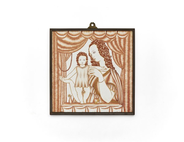 Gio Ponti "Madre con bambino" Formella in ceramica smaltata in nero, rosso e cel