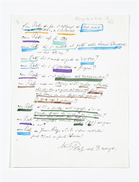 Autograph letter with polychrome underlines, sent to Giovanni Ratto, member of the editorial staff of "Domus" magazine. Not placed, dated March 3 [1970]. Black ink and colored markers on paper.. (27.9x21.5 cm.)