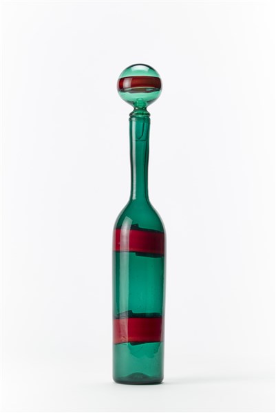 Bottiglia della serie "a fasce orizzontali". Venini, Murano, 1953-56. Vetro soffiato trasparente verde con fasce orizzontali rosso opaco. Disegno n 4582 del catalogo rosso Venini. Recante etichetta adesiva sotto la base "venini murano". (h cm 48)