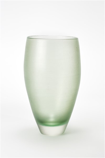 Vaso in vetro soffiato della serie "Incisi". Venini, Murano, 1956ca. Vetro pesante verde erba e incolore, rifinito da leggere incisioni orizzontali su tutta la superficie. Disegno n° 4835 del catalogo di fornace. (h cm 35,5)
