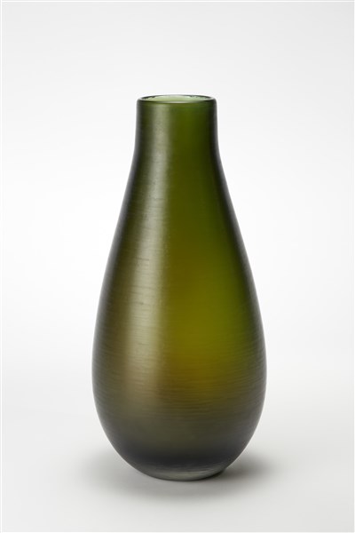 Vaso in vetro soffiato della serie "Incisi". Murano, 1956ca. Vetro pesante verde oliva a colori sovrapposti, rifinito da leggere incisioni orizzontali su tutta la superficie. Disegno n° 4813 del catalogo di fornace. Firmato ad acido sotto la base "venini murano ITALIA". (h cm 45)