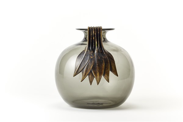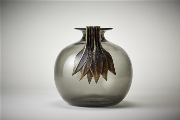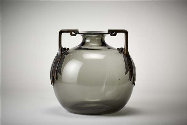 Vaso modello "Senlis - Anses bronze feuilles". Esecuzione Lalique, Francia, 1928ca. Vetro trasparente fumé, soffiato in stampo e molato con anse applicate in fusione di bronzo. Modello disegnato nel 1925, a catalogo dal 1928 al 1932 e non più prodotto dopo il 1947. Firmato all'acido "R. LALIQUE - FRANCE" sotto la base. (cm 23x26) (difetti e restauri)