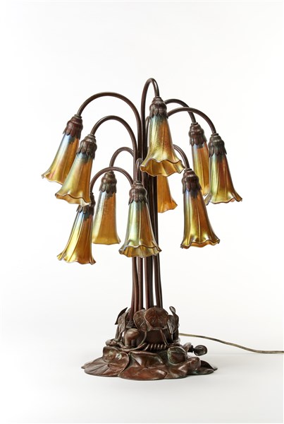 Lampada da tavolo modello "Ten Lily". New York, anni '10. Fusione di bronzo patinata di foggia vegetale a foglie e racemi, dieci luci con diffusore a corolla in vetro "Favrile". Marcata a incussione sotto la base "TIFFANY STUDIOS - NEW YORK" e con il numerale 381. Vetri iscritti "LCT". (h cm 52) (lievi difetti)