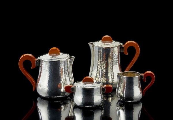 Tea and coffee service in hammered silver with bakelite handles and sockets made up of milk jug, coffee pot, teapot and sugar bowl. Italy, 1930s.