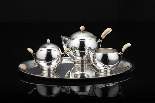 Servizio da tête-à-tête in argento a corpo liscio composto da: caffettiera, lattiera e zuccheriera e vassoio. Prese e anse in avorio. Titolo 800. Argentiere Enrico Messulam, Milano, 1940ca. (vassoio cm 31; h max cm 11) (g tot lordi 970 ca,) (lievi difetti)