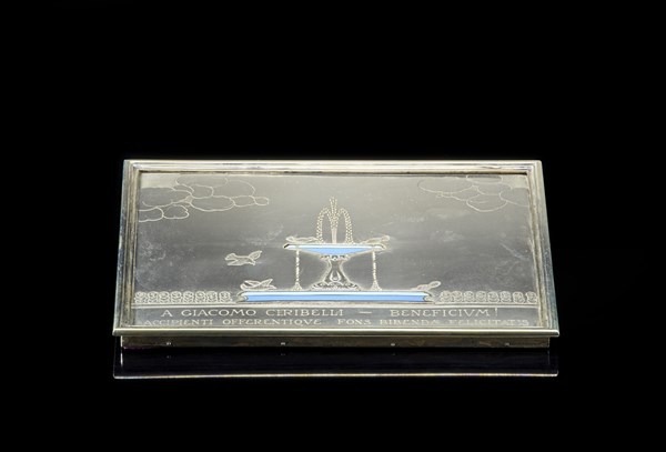 Targa in argento decorata con soggetto Liberty. Argentiere Mario Bucellati, Milano, anni '10. Decoro raffigurante una fontana rifinita a smalti azzurri, incastonata al centro di un paesaggio con uccelli, rose e nubi incise a mano. Recante l'iscrizione: "A GIACOMO CERIBELLI - BENEFICIUM! ACCIPIENTI OFFERENTIQUE FONS BIBENDAE FELICITATIS". Marcata sulla cornice "M. Buccellati", con punzone del Fascio e titolo 800. Incisione firmata "AP" alla base della fontana, a destra. (cm 21x16)