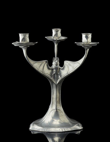 Candle holder in nickel-plated metal fusion with three arms model "4306". Execution by J.P. Kayserzinn, Krefeld, 1902/1904. Signed under the base. (h 30.5 cm.) (slight defects)