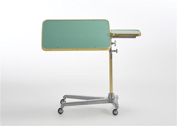 * Bookrest for bedroom. Produced by Officine Valsecchi, Milan, 1957. Structure in cast aluminum and chromed steel, top covered in greenish formica, edges in brass-plated aluminum. (98x76x41 cm.) (slight defects and losses)