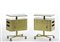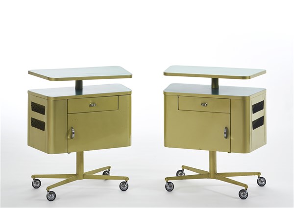 * Coppia di comodini su ruote ad un cassetto, un'anta, due ripiani a giorno e una tasca porta riviste su un lato. Produzione Officine Valsecchi, Milano, 1957. Acciaio stampato e verniciato color verde metallizzato, piani rivestiti in formica verdina, bordure in alluminio ottonato. (cm 66x74,5x35,5) (lievi difetti)