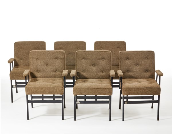 Lotto di sei poltroncine imbottite. Parabiago, anni '60. Struttura in tubolare di ferro verniciato nero a sezione quadrata e rivestimento in tessuto di lana marrone. Recanti etichetta della manifattura. (cm 59x84x63) (lievi difetti)