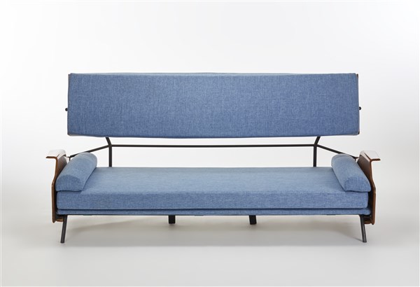 Divano con struttura in tubolare metallico saldato e verniciato nero e multistrato di legno curvato, cuscini rivestiti in tessuto azzurro. Italia, anni '50. (cm 200x90x88) (difetti e piccoli restauri)