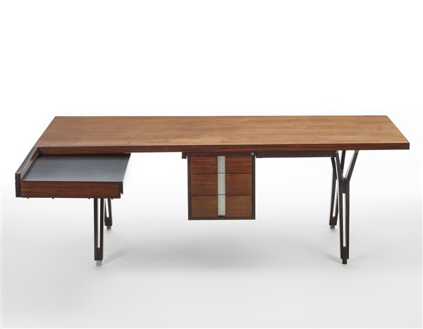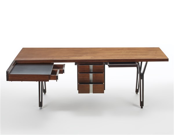 Scrivania da centro della serie "Urio". Roma, 1958ca. Struttura e piano in legno di palissandro indiano impiallacciato, bordato e massello, piano laterali rivestito in laminato nero, tre cassetti con fasce in lastra di alluminio, puntali in metallo. (cm 210x72x150) (lievi difetti e piccole mancanze)