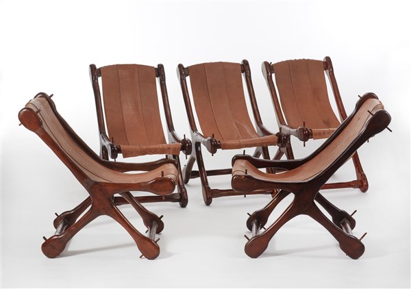 Gruppo di cinque poltrone in legno massello, seduta in cuoio. Messico, anni '60
