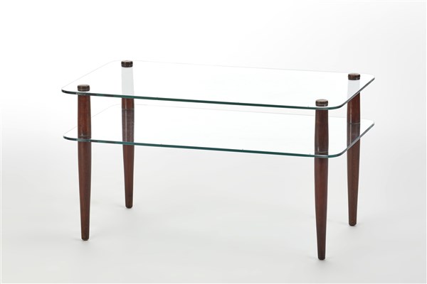 Coffee table with two shelves in "vitrex" tempered glass and legs in turned solid mahogany wood. Turin, 1950s. (89.5x50x53.5 cm.) (
