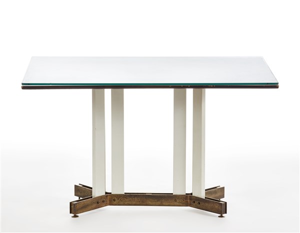 Scrittoio con piano in legno impiallacciato e bordato, sovrapiano in cristallo molato. Struttura in ottone naturale e verniciato bianco. Piedini regolabili. Italia, anni '50. (cm 120x73x80) (lievi difetti)