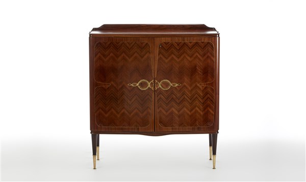 Mobile bar a due ante in legno di palissandro indiano massello e impiallacciato, intarsiato e profilato in ottone con motivi classicheggianti. Quattro gambe troncoconiche con puntali in fusione di ottone. Interno illuminato e specchiato con quattro cassettini e stipo a ribalta. Italia, anni '40/'50. (cm 119x132x45) (lievi difetti)