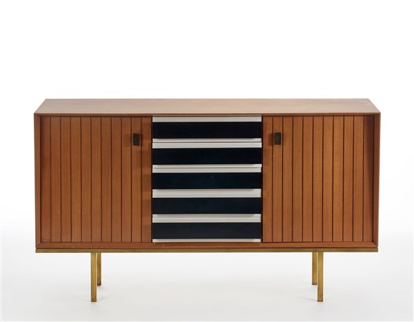 Mobile basso da centro in legno impiallacciato e bordato a due ante con sportelli e schienale a scanalature verticali e cinque cassetti rivestiti in laminato plastico bianco e nero. Gambe in metallo ottonato e maniglie in fusione di ottone. Italia, anni '50. (cm 150x86x49,5) (lievi difetti)