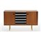 Low center piece of wood veneered and edged with two doors and back with vertical grooves and five drawers covered in white and black plastic laminate. Legs in brass-plated metal and handles in cast brass. Italy, 1950s. (150x86x49.5 cm.) (slight defects)