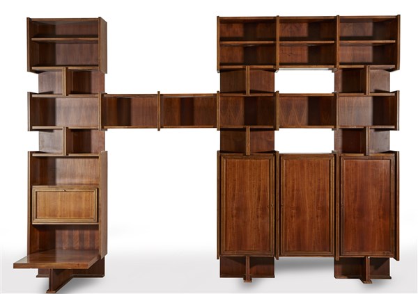 Grande libreria su disegno in legno di noce massello, impiallacciato e bordato, composta da una parte basamentale divisa in tre stipi ad ante, e un elemento con mobile bar a ribalta, sormontate da cinque livelli a ripiani a giorno suddivisi in tre settori collegati verticalmente. Unita a scaletta di analogo disegno. Milano, anni '60. (cm 438x315x83,5) (lievi difetti)