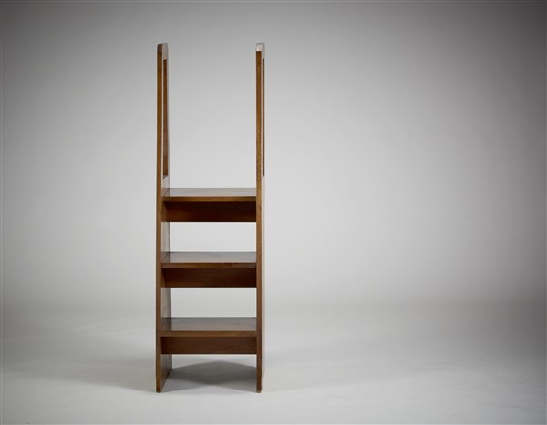 Large bookcase made of solid walnut wood, veneered and bordered, composed of a base divided into three cabinets with doors, and an element with a fall front desk, surmounted by five levels with open shelves divided into three sectors connected vertically. Combined with a similar design staircase. Milan, 1960s. (438x315x83.5 cm.) (slight defects)