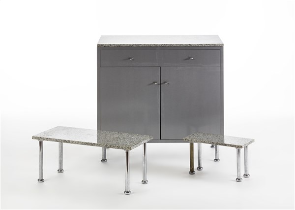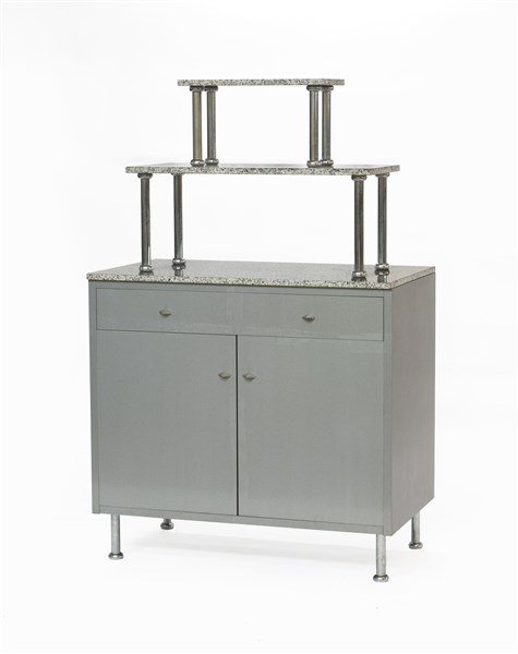 Two-door storage unit and one drawer of the series "Aforismi". Milan, 1984. Metallic gray laaminate finish, legs in chromed metal, top in Baveno granite, two overlapping shelves in chromed metal and Baveno grani. (96x150x53 cm.) (slight defects)