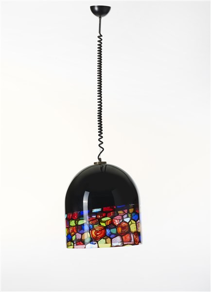 Lampada a sospensione a campana in vetro soffiato ametista scuro con grandi murrine policrome. Produzione Leucos, Salzano, anni '70. (h cm 110; d cm 36) (lievi difetti)
