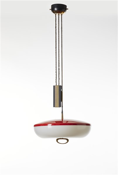 Lampada a saliscendi modello "1177". Milano, anni '50. Alluminio laccato rosso, ottone, perspex opale, metallo verniciato nero. (h cm 110; d cm 45) (lievi difetti)