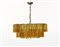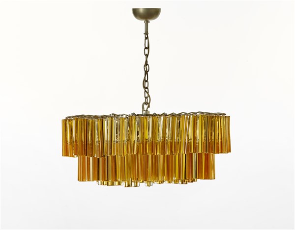 Lampada a sospensione della serie "Trilobo". Murano, anni '70. Struttura in tondino metallico cromato, pendagli trilobati in vetro sommerso ambrato e incolore. (h cm 80; d cm 70) (lievi difetti)