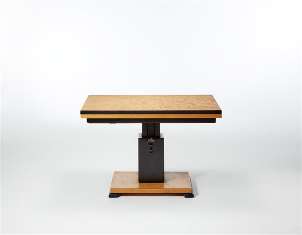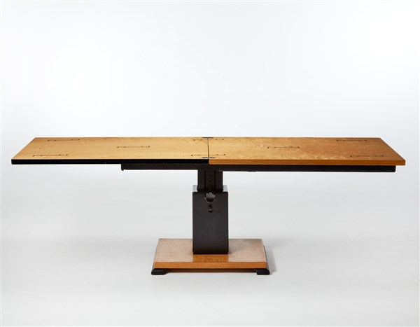 Tavolo allungabile e alzabile modello "Idealbordet typ. 3". Svezia, 1936ca. Legno ebanizzato, frassino, metallo. Reca targhetta metallica della manifattura. (chiuso cm 111,5x68x67,5; aperto cm 223x68x67,5) (lievi difetti)