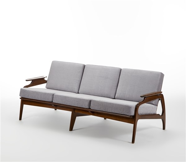 Divano. Craft Associates Inc, USA, anni '60. Struttura in legno massello e cuscini rivestiti in velluto grigio. (cm 189x72x72) (lievi difetti e restauri)