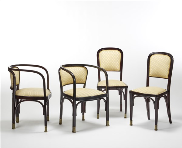 Lotto composto da una coppia di sedie e una coppia di poltroncine modello "715". Jacob & Josef Kohn, Vienna, 1900ca. Legno di faggio curvato al vapore e tinto, seduta e schienale imbottiti e rivestiti in tessuto ocra, puntali in fusione di ottone. (sedie cm 43x93x50; poltroncine cm 62x77x57) (lievi difetti e restauri)