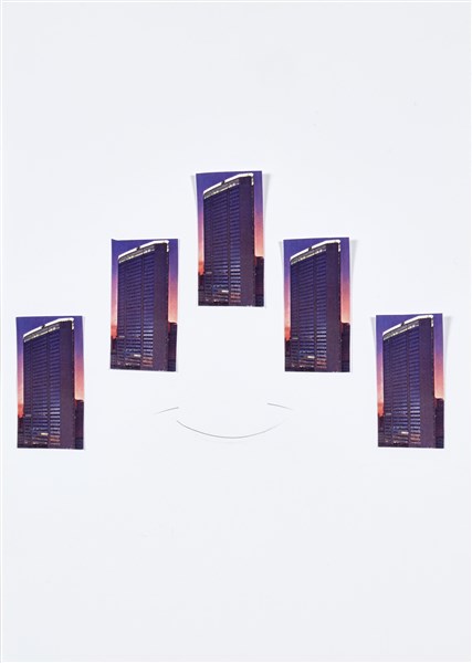 Composizione con cinque immagini del grattacielo Pirelli di Gio Ponti e una bocca sorridente. Milano, 2004. Collage, fotocopie colorate, grafite su carta. (cm 30x21)