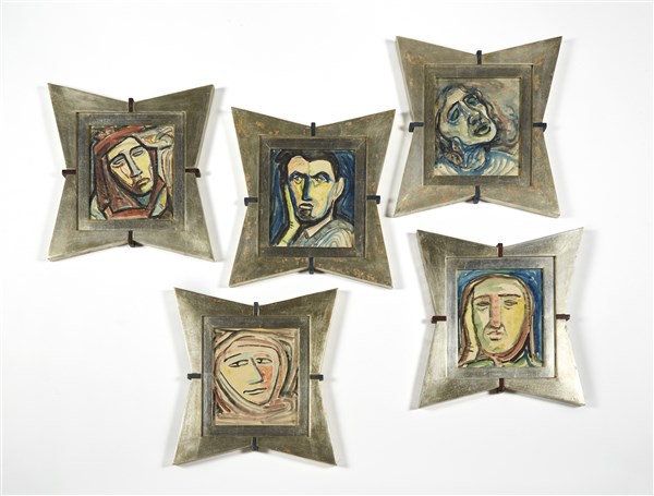 Lotto di cinque ritratti di volti. Acquerelli su carta. La Spezia, anni '40/'50. Firmati A. Magli (cm 25x22.5). In cornice intagliata e argentata.