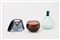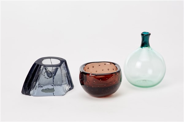 Lotto composto da un vasetto della serie "Monofiori" in vetro soffiato verde chiaro e verde scuro, una ciotola in vetro ametista trasparente a bolle e un vasetto in vetro massello grigio azzurro. Murano, secolo XX. Firmati sotto la base. (h max cm 9)